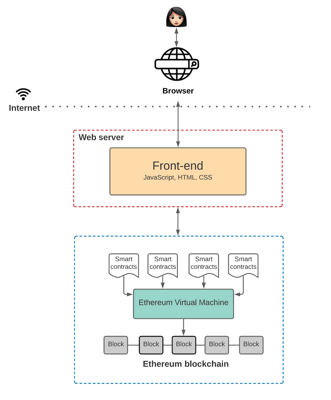 Finally, we have the frontend. As we mentioned before, it defines the UI logic, but the frontend also communicates with the application logic defined in smart contracts.