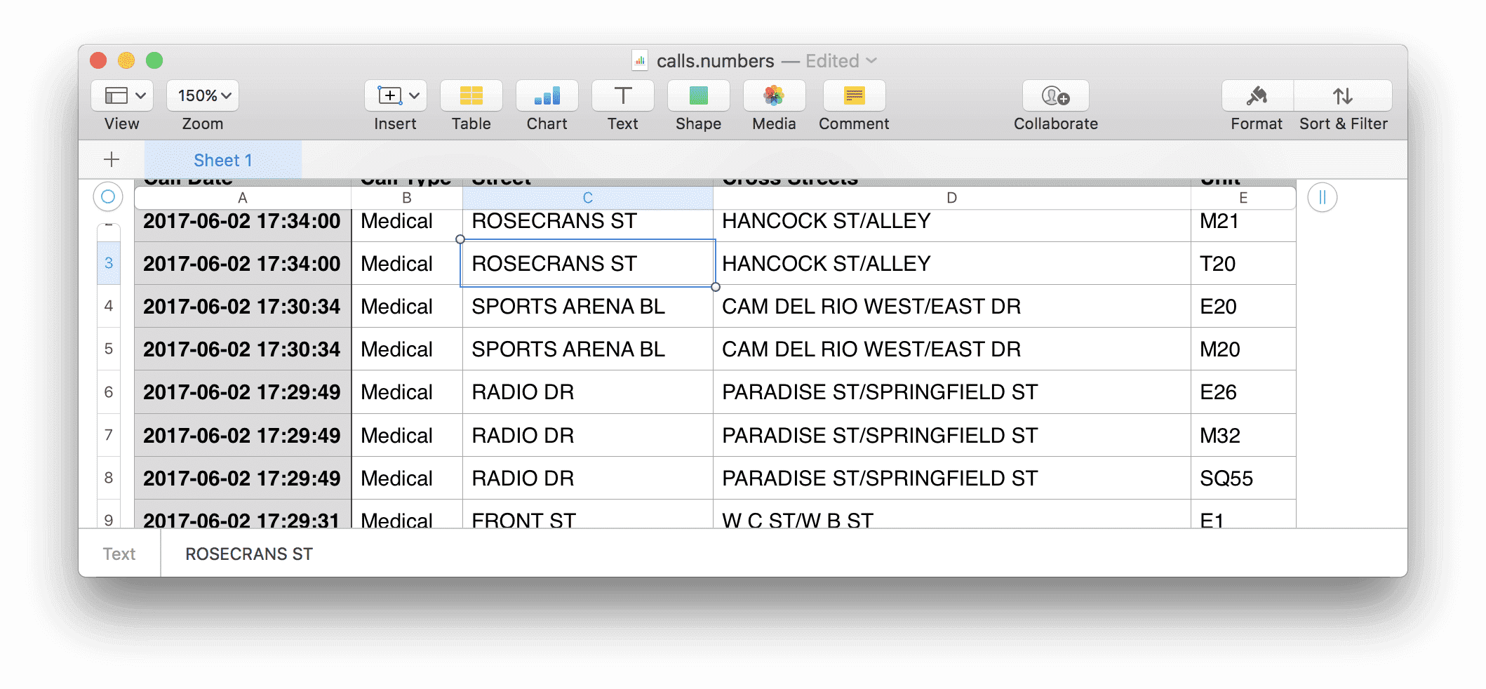 calls_df.to_csv("calls.csv", index=False)Run that and double-click on calls.csv to open it up in your spreadsheet app: