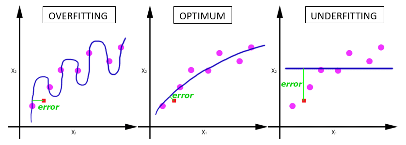 As the number of epochs increases, more number of times the weight are changed in the neural network and the curve goes from underfitting to optimal to overfitting curve.